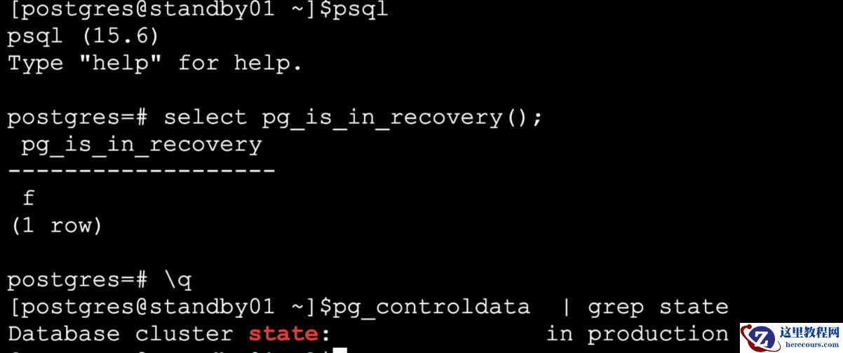 1、停止PG服务 [root@standby01 ~]# su - postgres [postgres@standby01 ~]$ pg_ctl stop 2、删除“standby.signal”文件 rm -rf /pgccc/pgdata/standby.signal 3、修改参数文件,注释primary_conninfo sed -i 's/primary_conninfo/#primary_conninfo/g' /pgccc/pgdata/postgresql.conf 4、启动PG服务 [root@primary ~]# su - postgres [postgres@primary ~]$ pg_ctl start