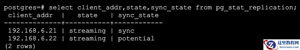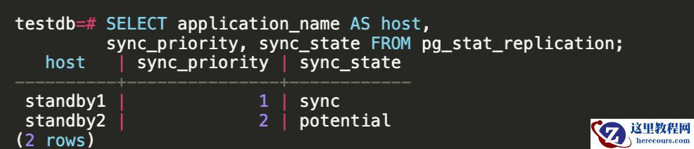sync_state是备用服务器的状态。 sync_state属性指示备用服务器的状态。 它可以是以下值之一: 1.sync:备用服务器处于同步模式, 是当前正在工作的优先级最高的备用服务器。 2.potential:备用服务器处于同步模式, 是当前正在工作的优先级较低的备用服务器。 如果当前同步备用服务器失败, 则此备用服务器将升级为同步状态。 3.async:备用服务器处于异步模式。 (它永远不会处于“同步”或“潜在”模式。) 通过发出以下查询,可以显示备用服务器的优先级和状态:
