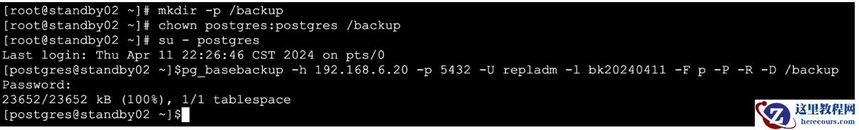 --在从库对主库进行备份 mkdir -p /backup chown postgres:postgres /backup su - postgres pg_basebackup -h 192.168.6.20 -p 5432 -U \ repladm -l bk20240411 -F p -P -R -D /backup