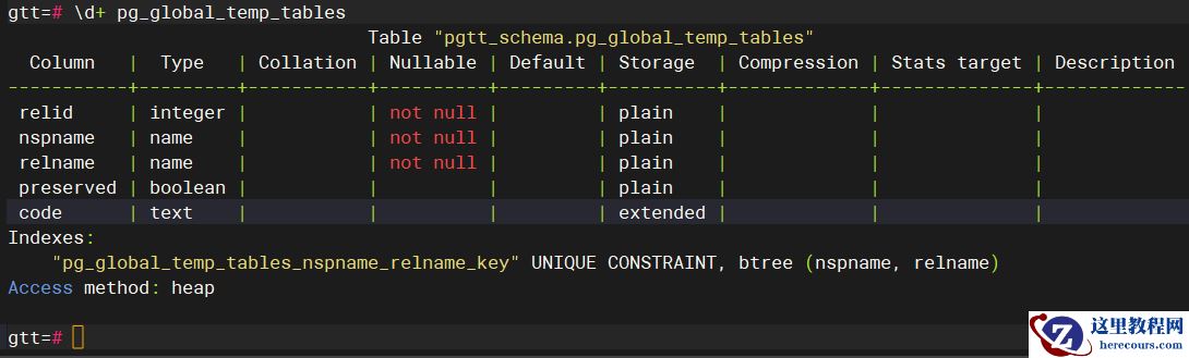 其实pgtt也是这么一个实现思路,当成功创建pgtt拓展的时候,会附加上表 pgtt_schema.pg_global_temp_tables,这张表将用作存储全局临时表的数据信息。