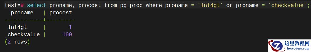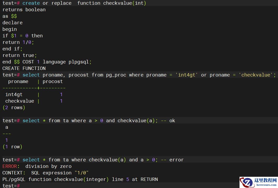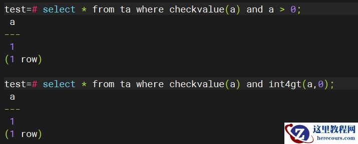 test=# select * from ta where a > 0 and checkvalue(a); a --- 1 (1 row) test=# select * from ta where checkvalue(a) and a > 0; -- 交换顺序 a --- 1 (1 row)