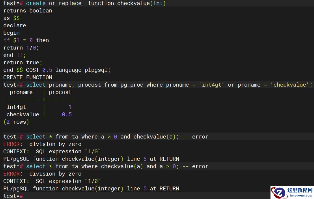 test=# select * from ta where a > 0; a --- 1 (1 row) test=# select * from ta where checkvalue(a); ERROR: division by zero CONTEXT: SQL expression "1/0" PL/pgSQL function checkvalue(integer) line 5 at RETURN