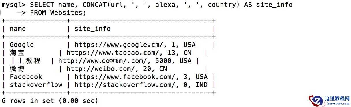 SELECT name, CONCAT(url, ', ', alexa, ', ', country) AS site_infoFROM Websites;