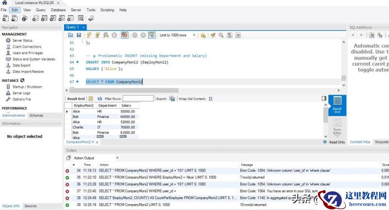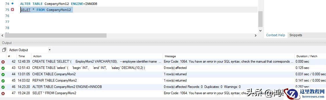 数据库名称: companyMoni_db表名称: EmployMoni任务: 从 EmployMoni 表中提取所有行。当尝试使用 MySQL Workbench 8.0 从名为 companyMoni_db 的数据库中的 "EmployMoni" 表提取数据时,遇到以下错误: