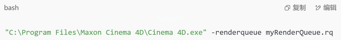 Cinema 4D支持通过命令行加载`.rq`文件并进行后台渲染。例如可将队列放入服务器远程执行: