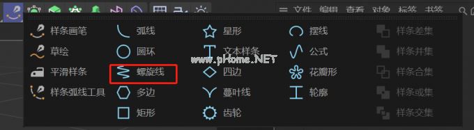 想要模型跟随路径移动,我们首先设置一个路径,这里找到样条,给它一个螺旋线。
