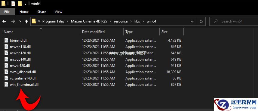 - 在该文件夹中,搜索`win_thumbnail.dll`文件。如果该文件存在,您可以进行下一步。如果该文件缺失,您可能需要重新安装Cinema 4D。
