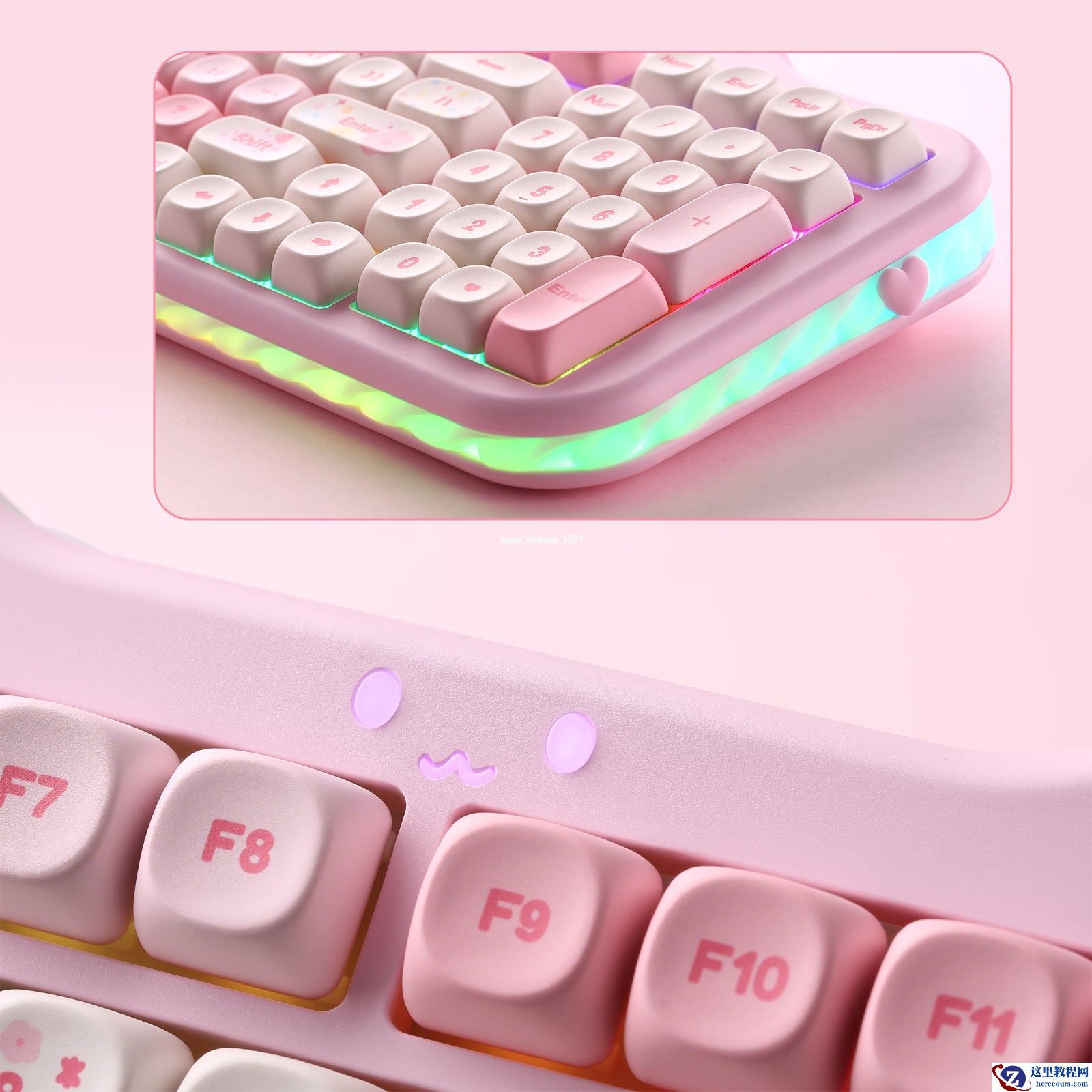 YUNZII C98 延续系列的猫猫笑脸状态指示灯、“三明治”侧裙、小鱼外形 2.4GHz 接收器等萌系设计元素,可选椰奶 V2 轴、糖果轴这两种线性轴体开关,包含粉、米、紫三种配色方案。