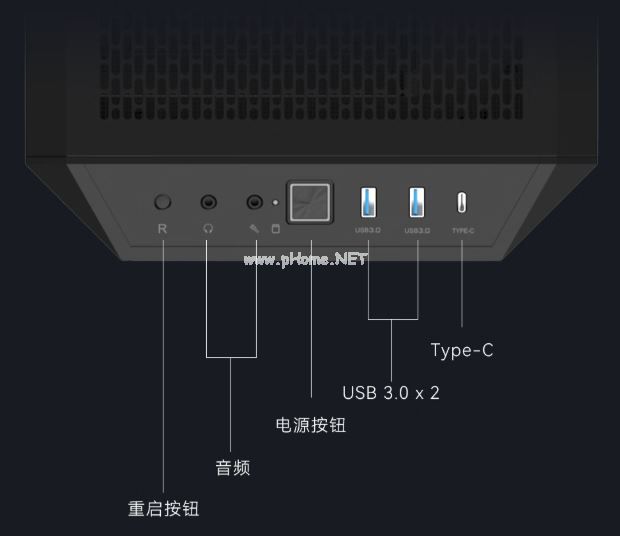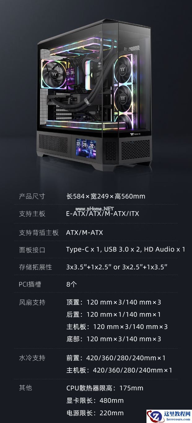 该机箱采用四块玻璃拼接而成的海景房设计,整体尺寸为 584 x 249 x 560mm,兼容 E-ATX / ATX/M-ATX/ ITX 主板,支持 ATX/M-ATX 背插主板。机箱顶置 1 个 USB-C 接口、2 个 USB-A 3.0 接口、2 个 3.5mm 音频接口。