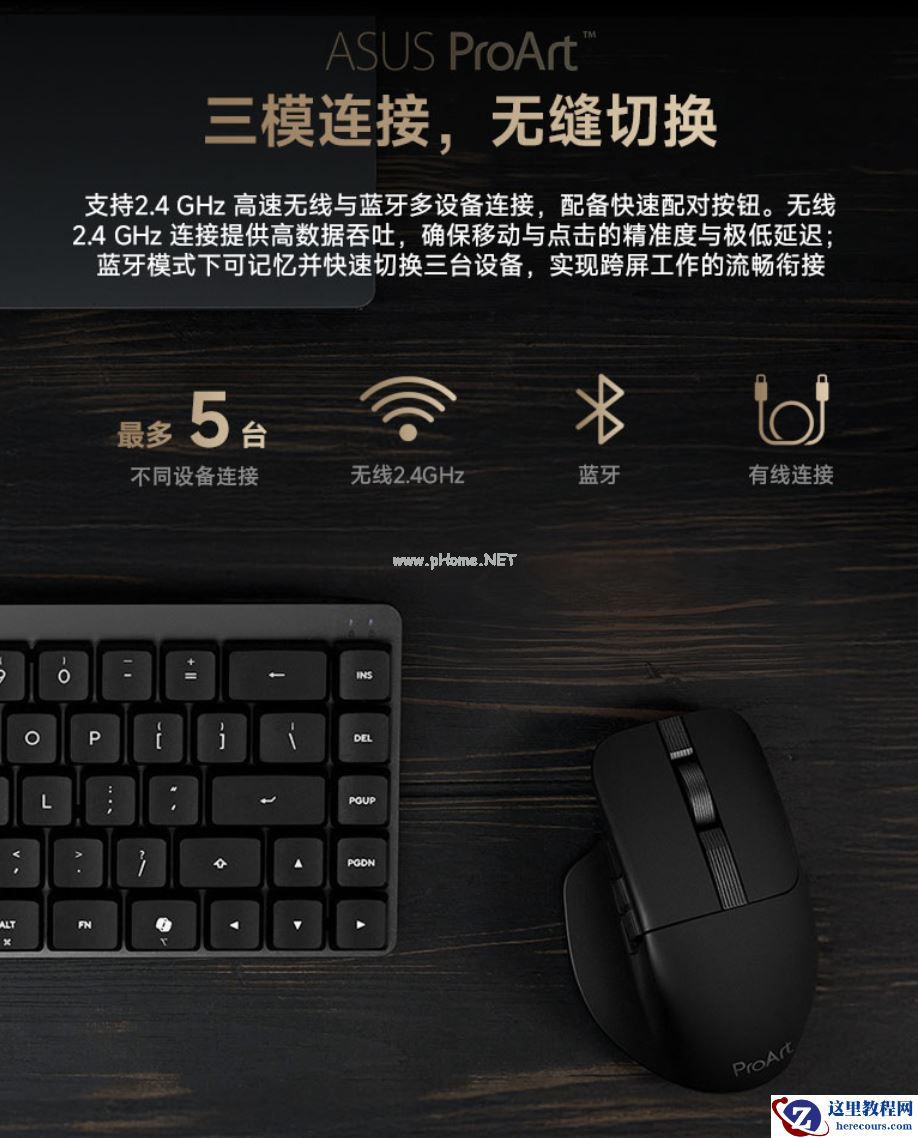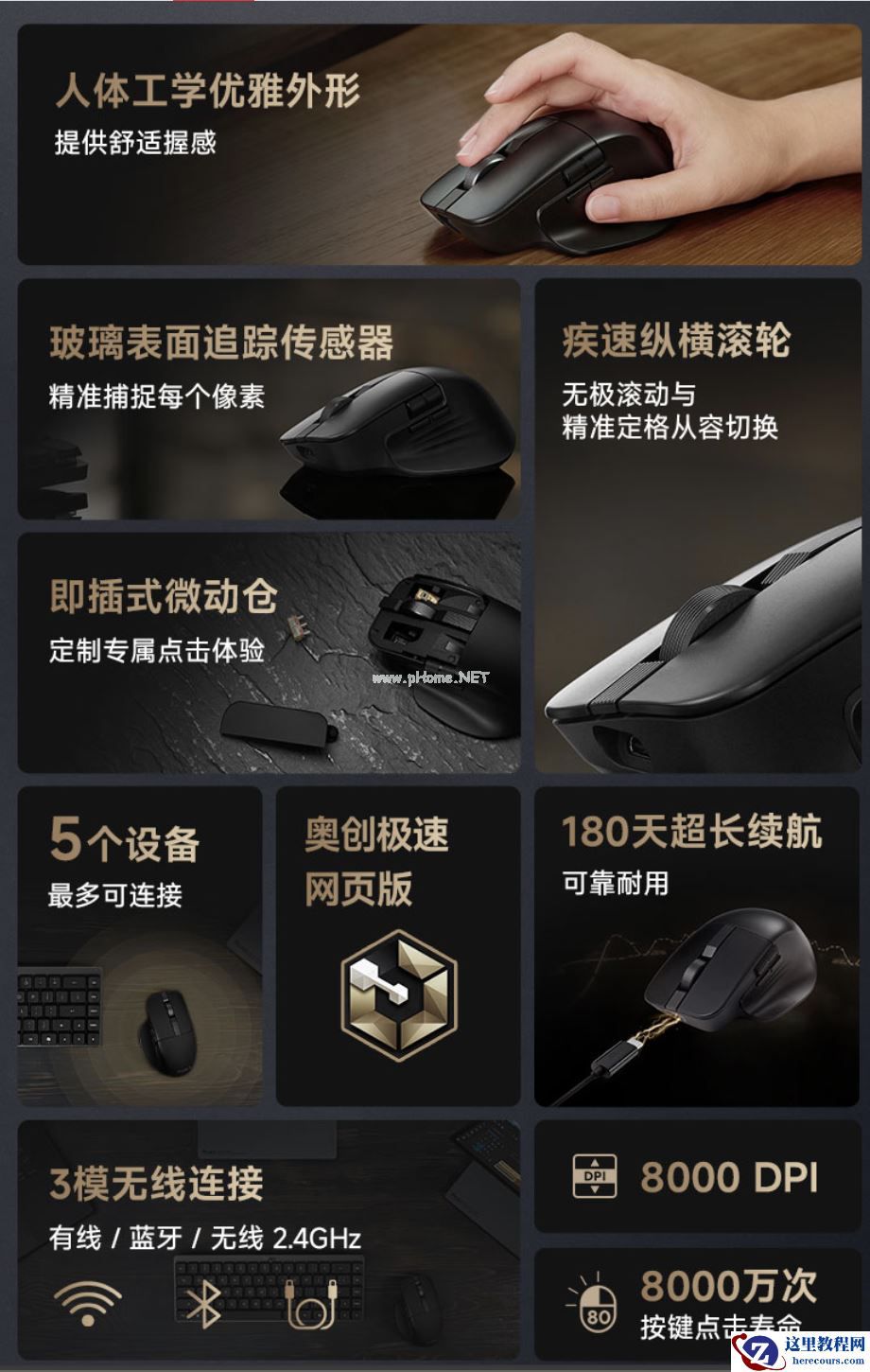 此外,这款鼠标支持 2.4G、蓝牙和有线等连接方式,最多可连接 5 台设备。