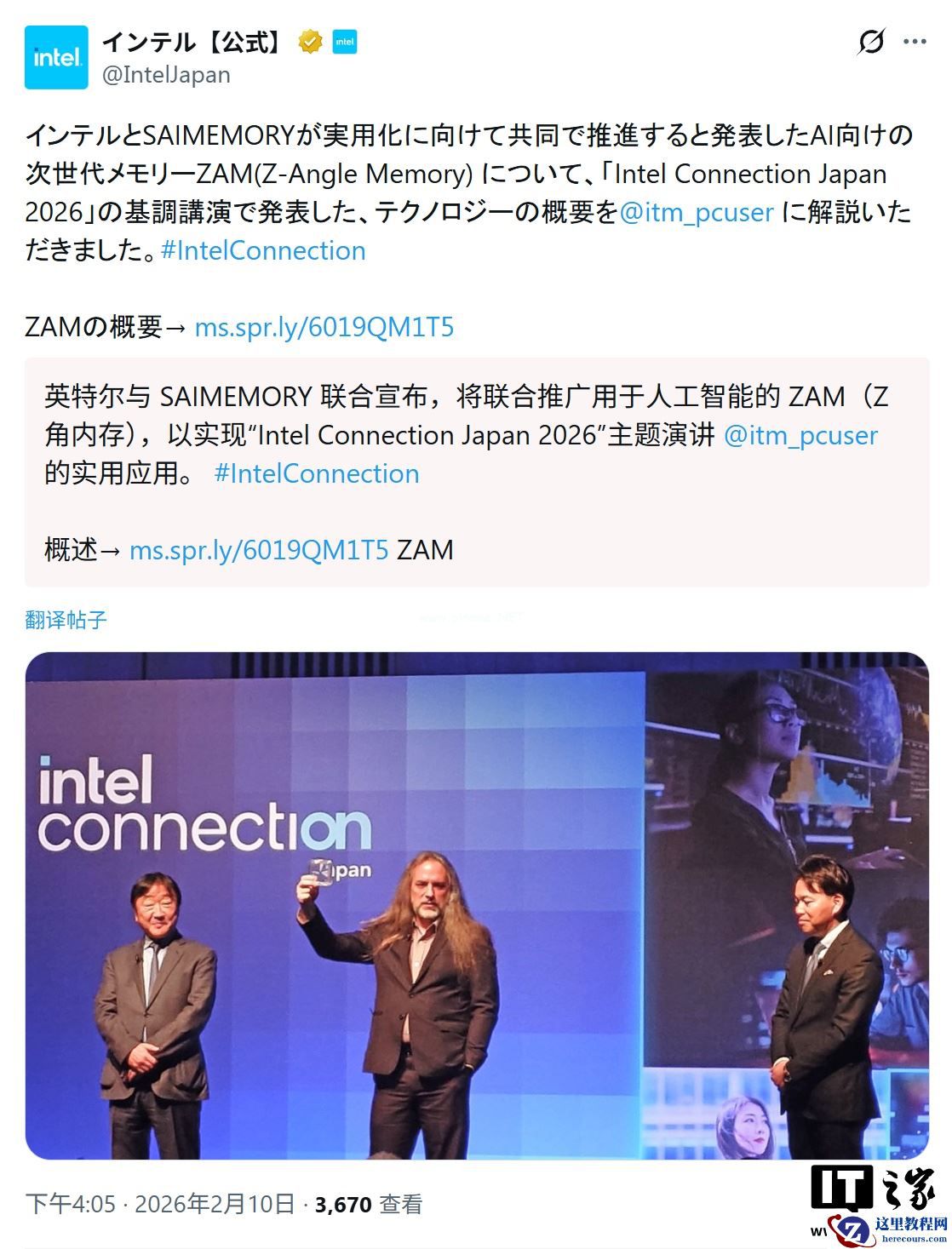 2 月 11 日消息,科技媒体 Wccftech 昨日(2 月 10 日)发布博文,报道称在 Intel Connection Japan 2026 活动中,英特尔首次公开了“Z-Angle Memory”(ZAM)内存原型。