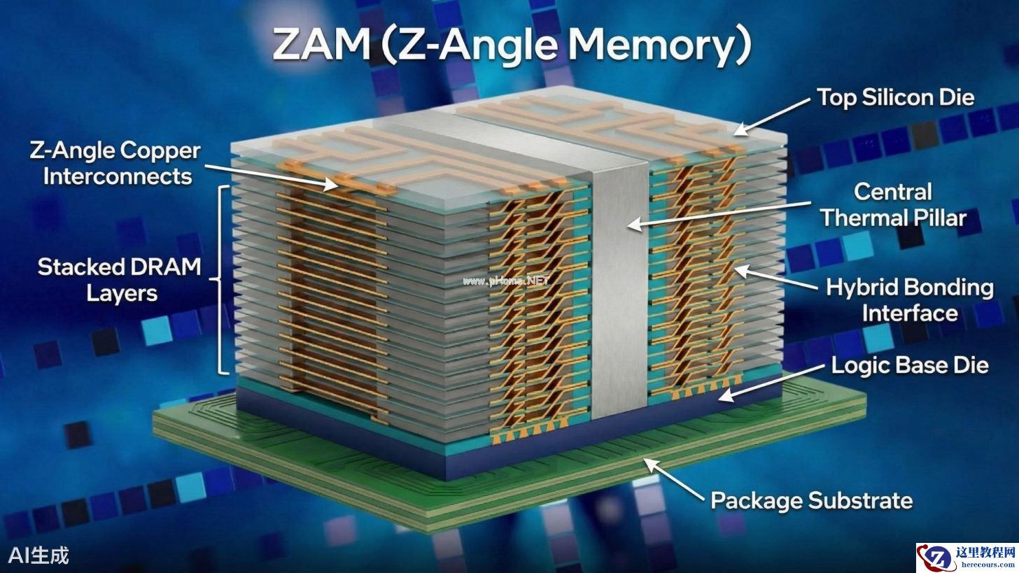 援引博文介绍,ZAM 技术的核心在于其独特的“Z-Angle”架构。与传统 HBM 内存垂直钻孔(TSV)的连接方式不同,ZAM 采用了错位互连拓扑结构(staggered interconnect topology),在芯片堆叠内部实现对角线走线。英特尔指出,这种架构设计能从物理层面有效解决现有内存解决方案面临的散热瓶颈,并大幅优化计算性能。