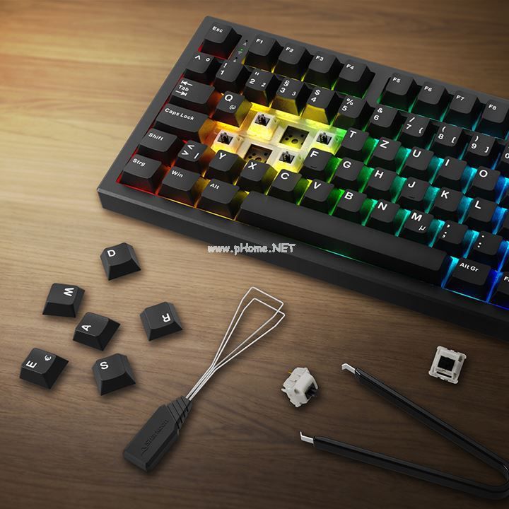 SKILLER SGK55W 采用 Gasket 固定设计,配备轴体热插拔 + 南向 RGB 背光的 PCB、PC 定位板、硅胶垫层、隔音双层泡沫阻尼;其基于 QMK 固件,支持 VIA 改键。