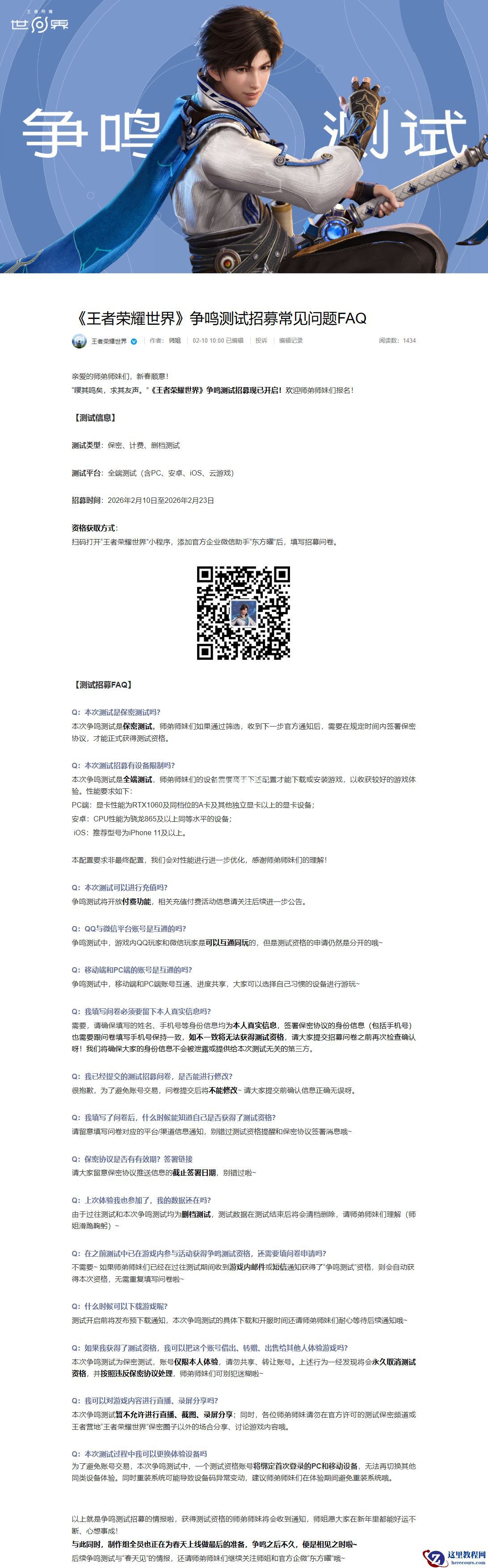 整理《王者荣耀世界》“争鸣测试”重点信息如下: