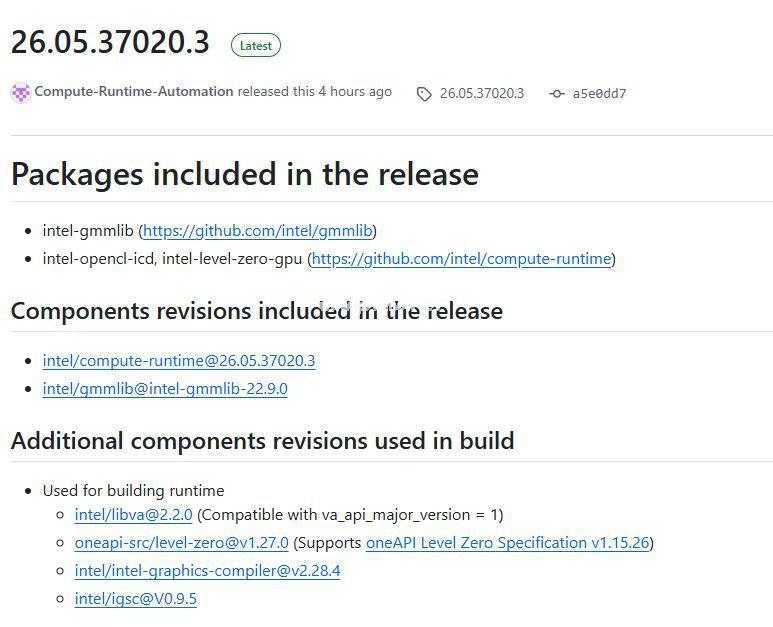 https://github.com/intel/compute-runtime/releases/tag/26.05.37020.3