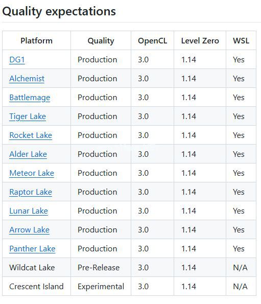 该版本持续兼容 Tigerlake 至 Battlemage、Panther Lake 硬件平台,并提供了 Nova Lake 与 Crescent Island 的实验性支持。