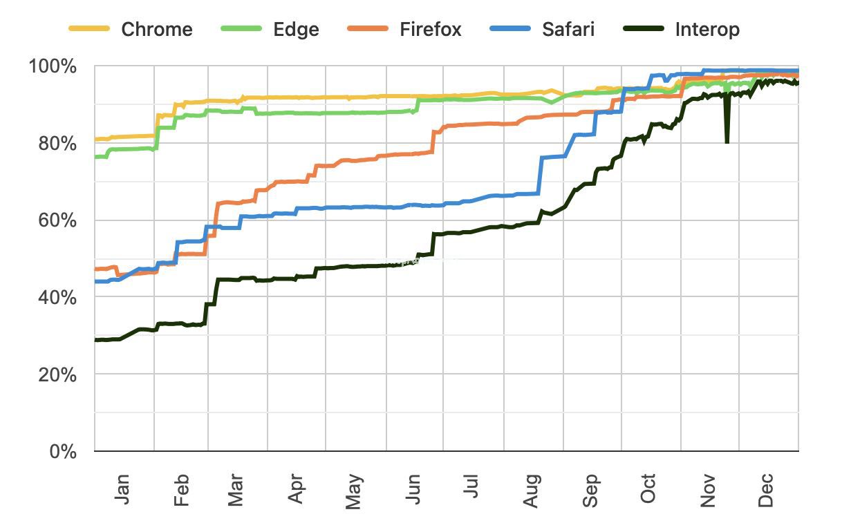 注:Interop 是由苹果、谷歌、微软、Mozilla 等公司联合发起的行业倡议项目,通过统一的标准测试,消除不同浏览器(如 Chrome、Safari、Edge)在显示网页时的差异,确保网页在所有设备上表现一致。