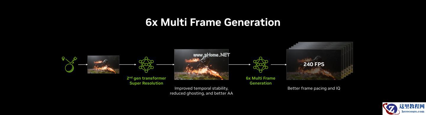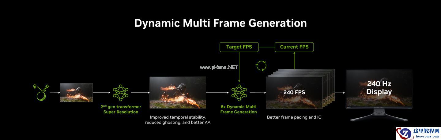 在 50 系显卡上,从 4 倍多帧生成提升至 6 倍多帧生成,可将采用路径追踪技术的游戏在 4K 分辨率下的帧率提升高达 35%;而动态多帧生成能让最终帧数匹配显示器刷新率,在帧率、画质、响应速度之间达到平衡。