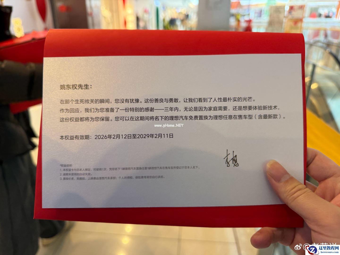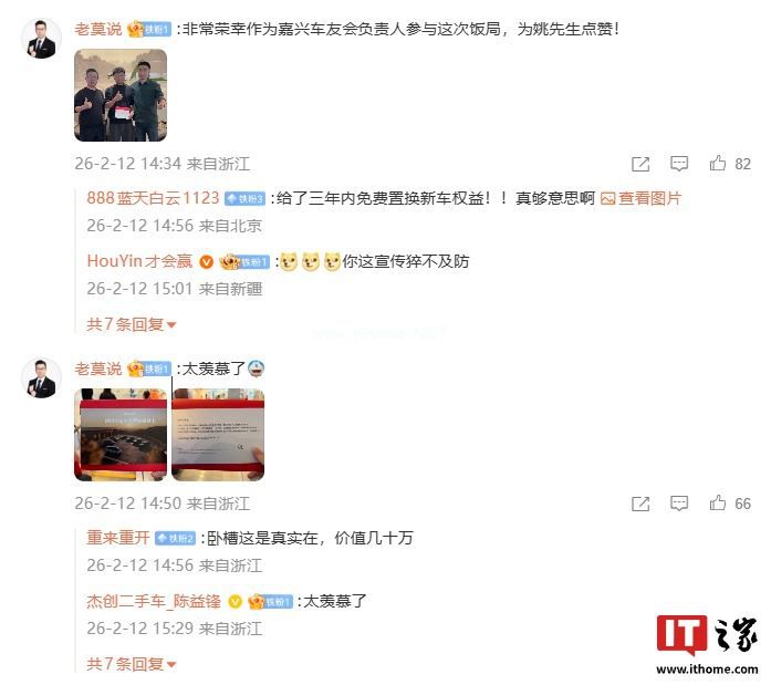 注意到,嘉兴车友会负责人 @老莫说 在评论区透露自己也参与了此次饭局,并晒出了李想为这名见义勇为的车主送上的权益 —— 三年内,可以将名下的理想汽车免费置换为理想任意在售车型(含最新款,权益有效期为:2026 年 2 月 12 日至 2029 年 2 月 11 日)。