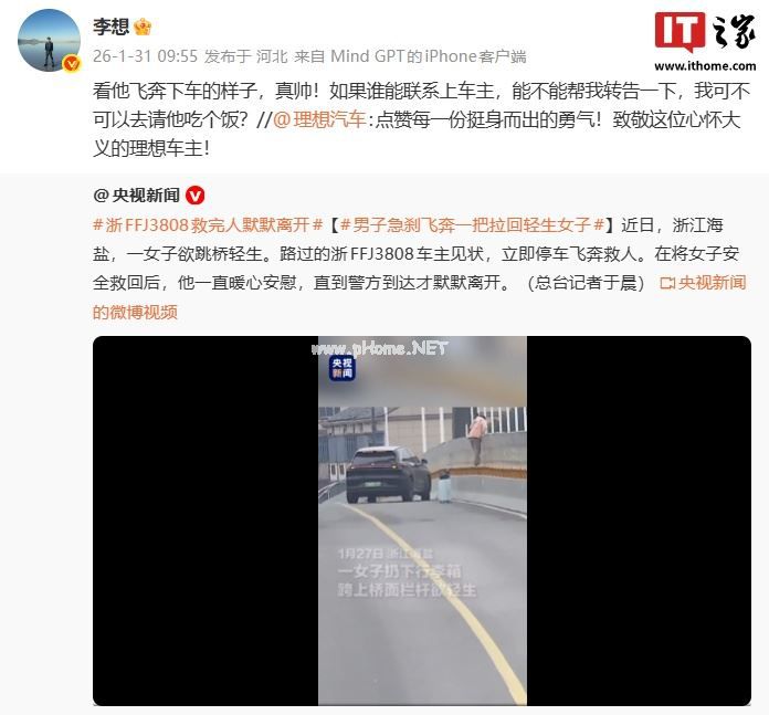 2 月 12 日消息,央视新闻今年 1 月报道了一起见义勇为的事迹,在浙江海盐,车牌号为“浙 FFJ3808”的车主发现一女子欲跳桥轻生后,立即停车飞奔救人,直到警方到达才默默离开。而视频画面显示,这名车主的座驾是一款理想汽车。