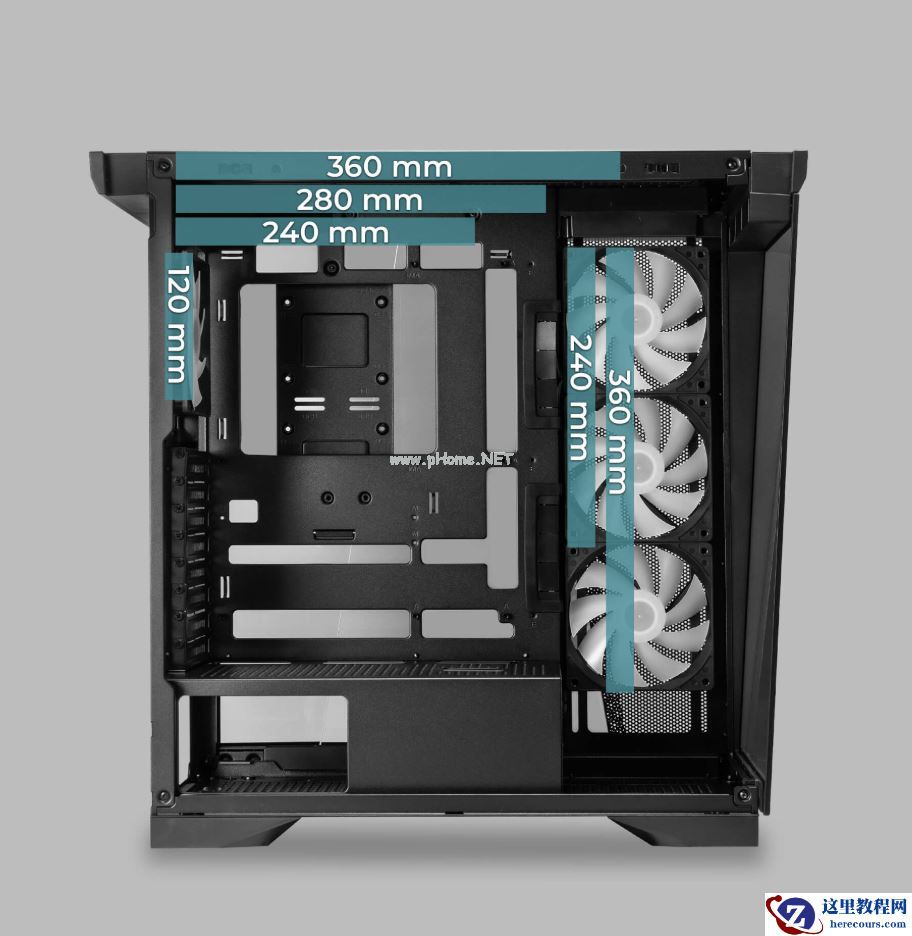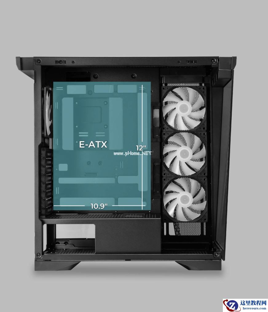 据介绍,这款机型支持 Mini-ITX、Micro-ATX、ATX 和 E-ATX 主板,兼容背插产品,CPU 散热器限高 175mm、显卡限长 435mm,电源限长则是 238mm,自带双 3.5mm、2.5mm 硬盘安装孔位。
