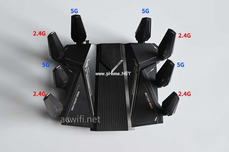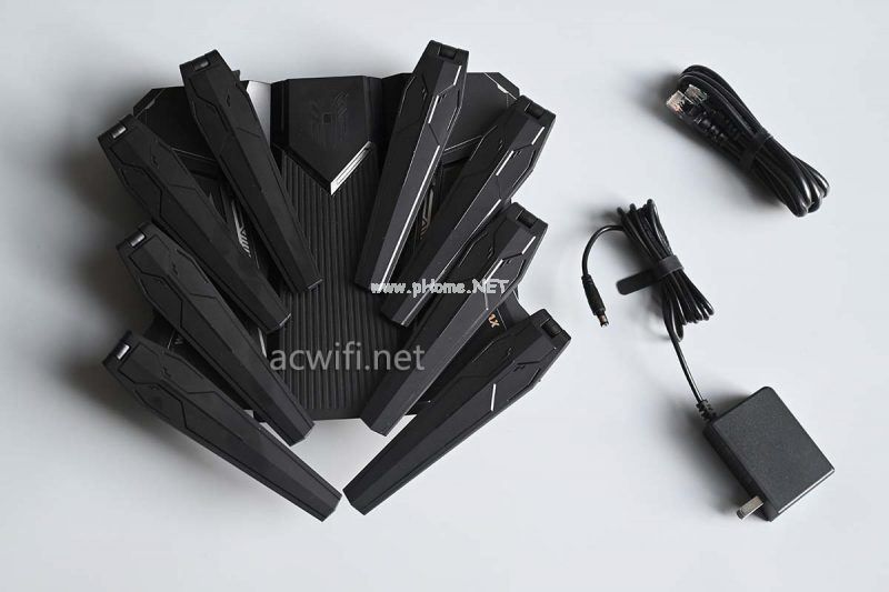 一共外置了8根天线,双频2.4G和5G的天线布局如下: