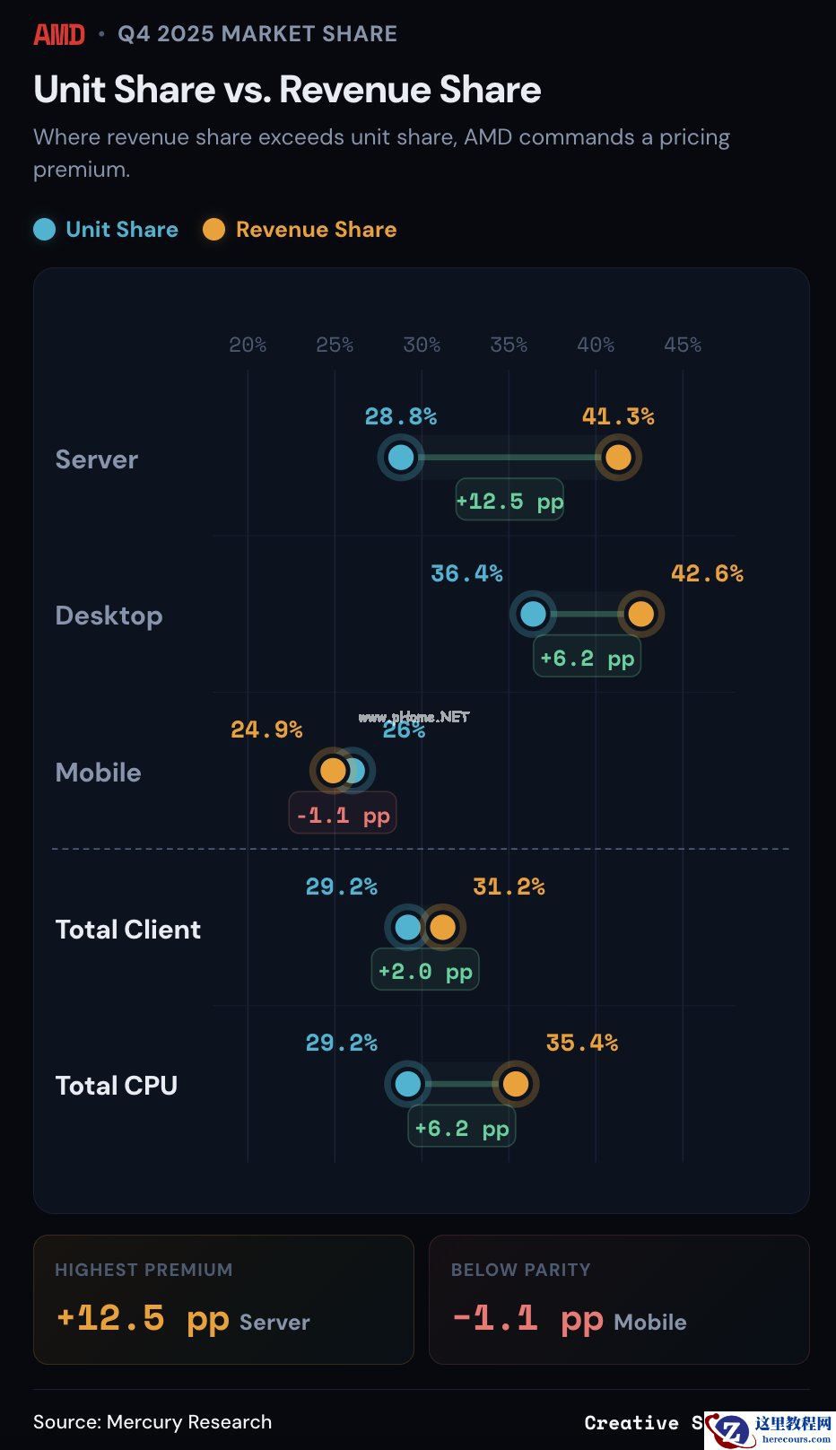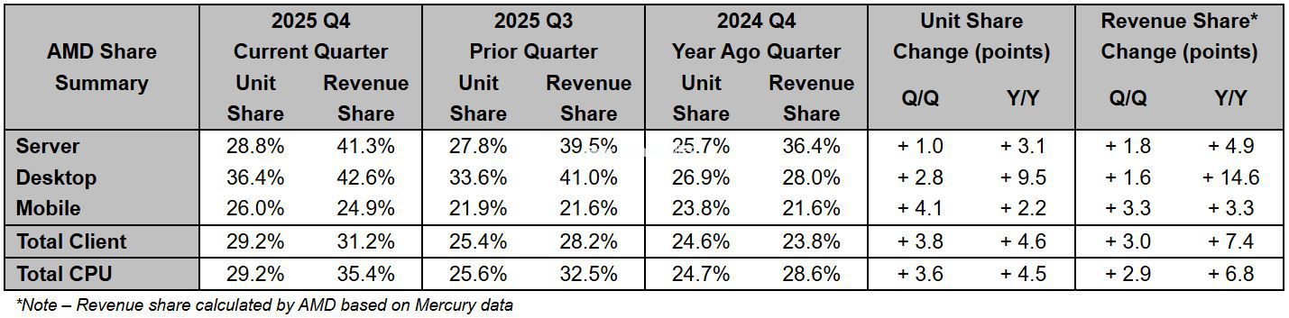 2 月 12 日消息,市场调查机构 Mercury Research 于 2 月 10 日发布报告,显示在 2025 年第 4 季度,AMD 在全球 CPU 市场份额实现爆发式增长,出货额与出货量双双创下历史新高。