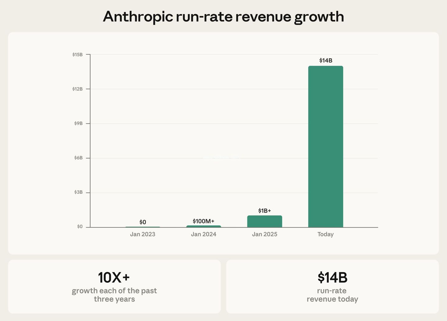Anthropic 表示,该企业当前的年化收入水平已达到 140 亿美元,连续三年实现翻倍;《财富》世界十强企业中已有 8 家成为 Claude 的客户;年消费超过 10 万美元的 Claude 客户数量在一年间增长了 7 倍,年消费超过 100 万美元的客户突破 500 家。