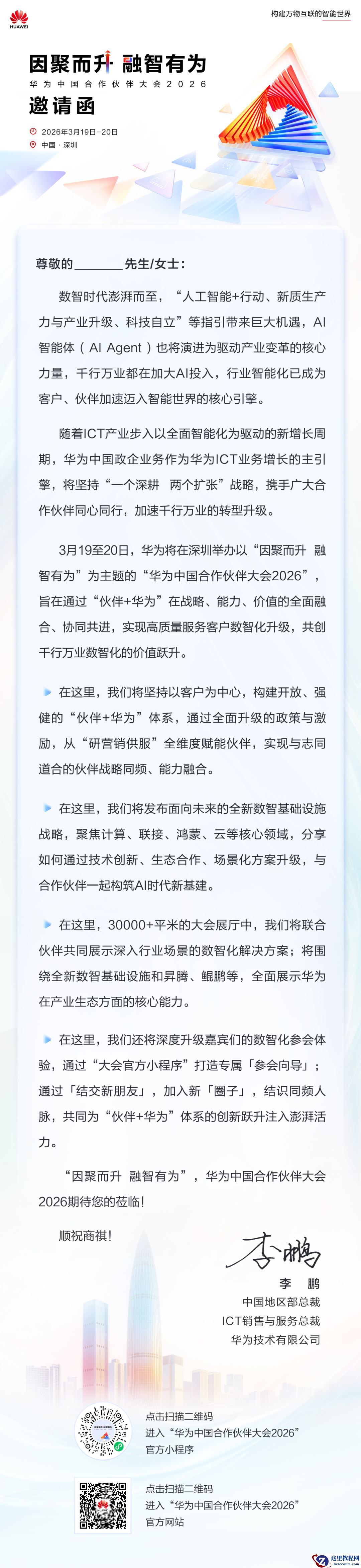 2 月 13 日消息,以“因聚而升,融智有为”为主题的华为中国合作伙伴大会 2026 官宣将于 2026 年 3 月 19 日-20 日在深圳举行。