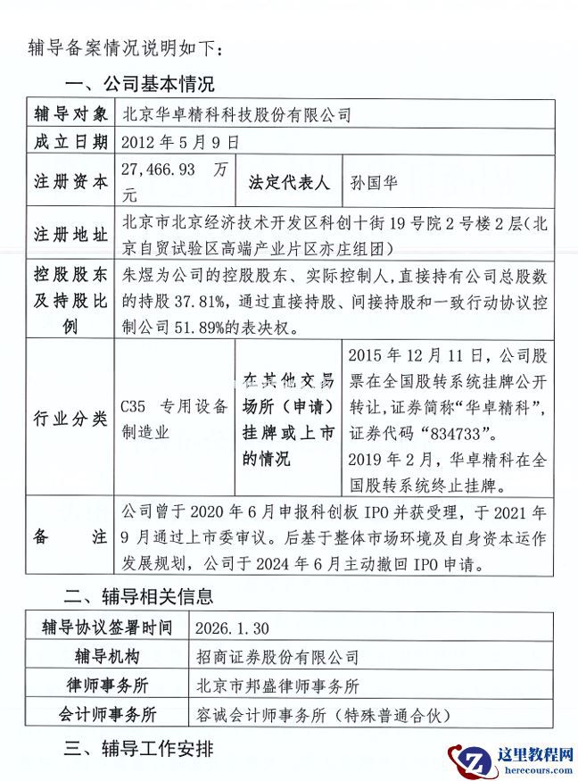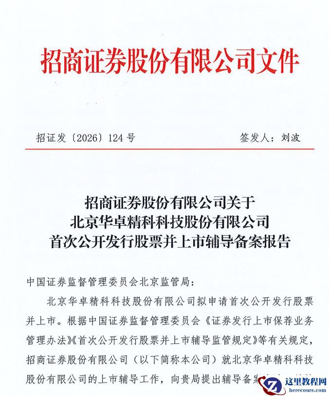 2 月 13 日消息,证监会网站今日披露,北京华卓精科科技股份有限公司(以下简称“华卓精科”)于 2026 年 2 月 12 日在北京证监局办理辅导备案登记,拟首次公开发行股票并上市,辅导券商为招商证券。