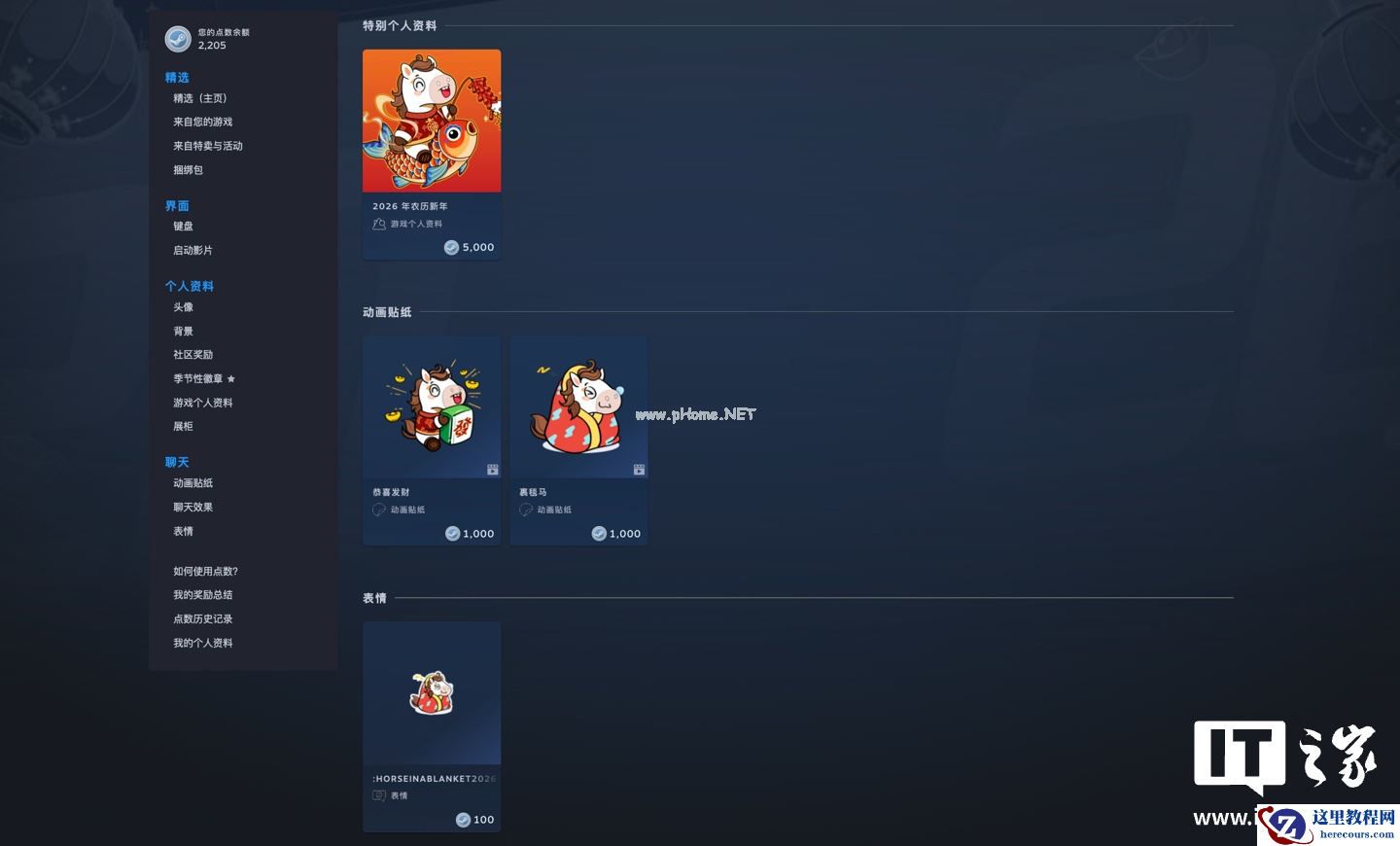 官方同步为本次活动带来了点数商店物品,包含“2026 年农历新年”游戏个人资料、“恭喜发财”“裹毯马”动画帖子、“裹毯马 2026”表情,附点数商店(https://store.steampowered.com/points/shop/app/4269690)。
