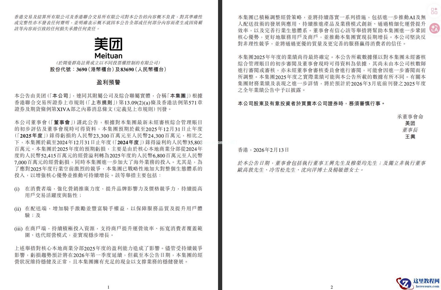 2 月 13 日消息,美团今日在港交所公告,根据对集团最新未经审核综合管理账目的初步评估及董事会现时可得资料,预期于截至 2025 年 12 月 31 日止年度录得亏损约人民币 233 亿元至人民币 243 亿元,相比之下,美团 2024 年度录得溢利约人民币 358.08 亿元。