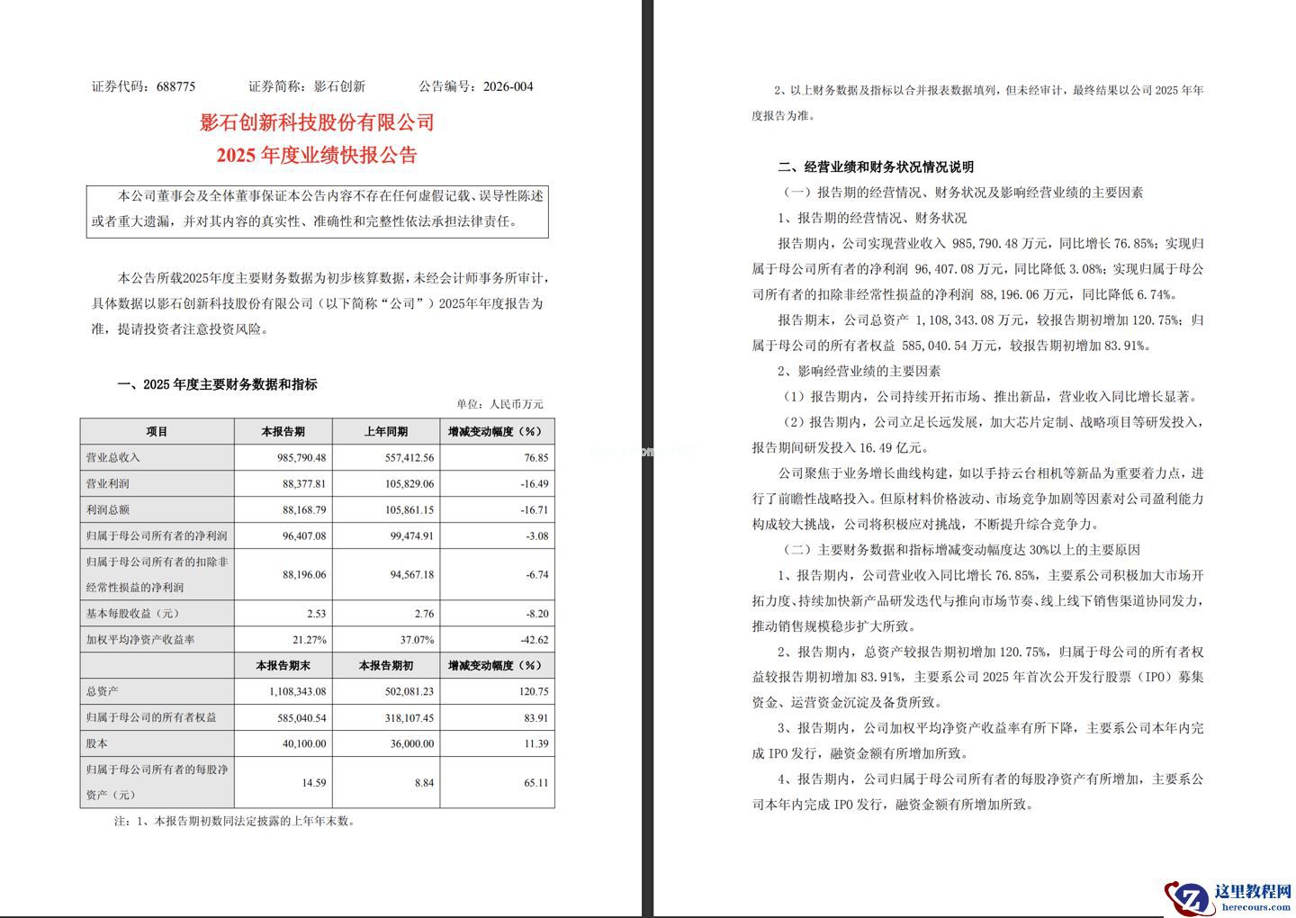 2 月 13 日消息,影石创新今日发布 2025 年度业绩快报,公司实现营业总收入 98.58 亿元,同比增 76.85%,营收创历史峰值;归母净利润 9.64 亿元,同比微降 3.08%。