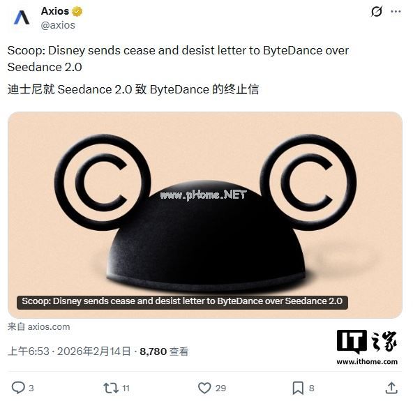 根据 Axios 获得的信件副本,华特迪士尼公司已于当地时间周五向字节跳动发函,指控对方在训练和开发 Seedance 2.0 模型时未经许可使用迪士尼作品,要求字节跳动“停止侵权且不得再犯”。