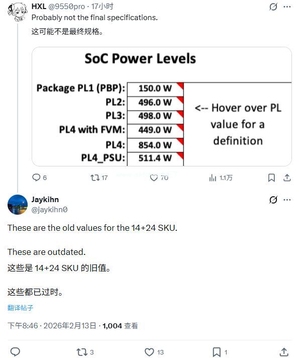 根据 @9550pro 昨日公布的一份 SoC 功耗等级设定表,Nova Lake-S 早期开发版本功耗确实足够惊人,但 Jaykihn 称这一数据已经“过时”,UNIKO's Hardware 也持相同观点。