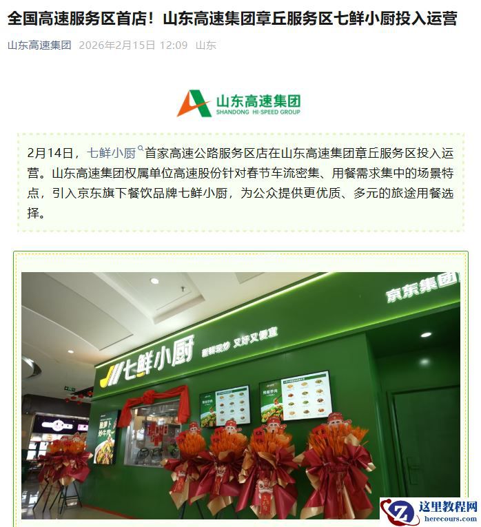 2 月 15 日消息,山东高速集团宣布,2 月 14 日,京东七鲜小厨首家高速公路服务区店在济南章丘服务区投入运营。