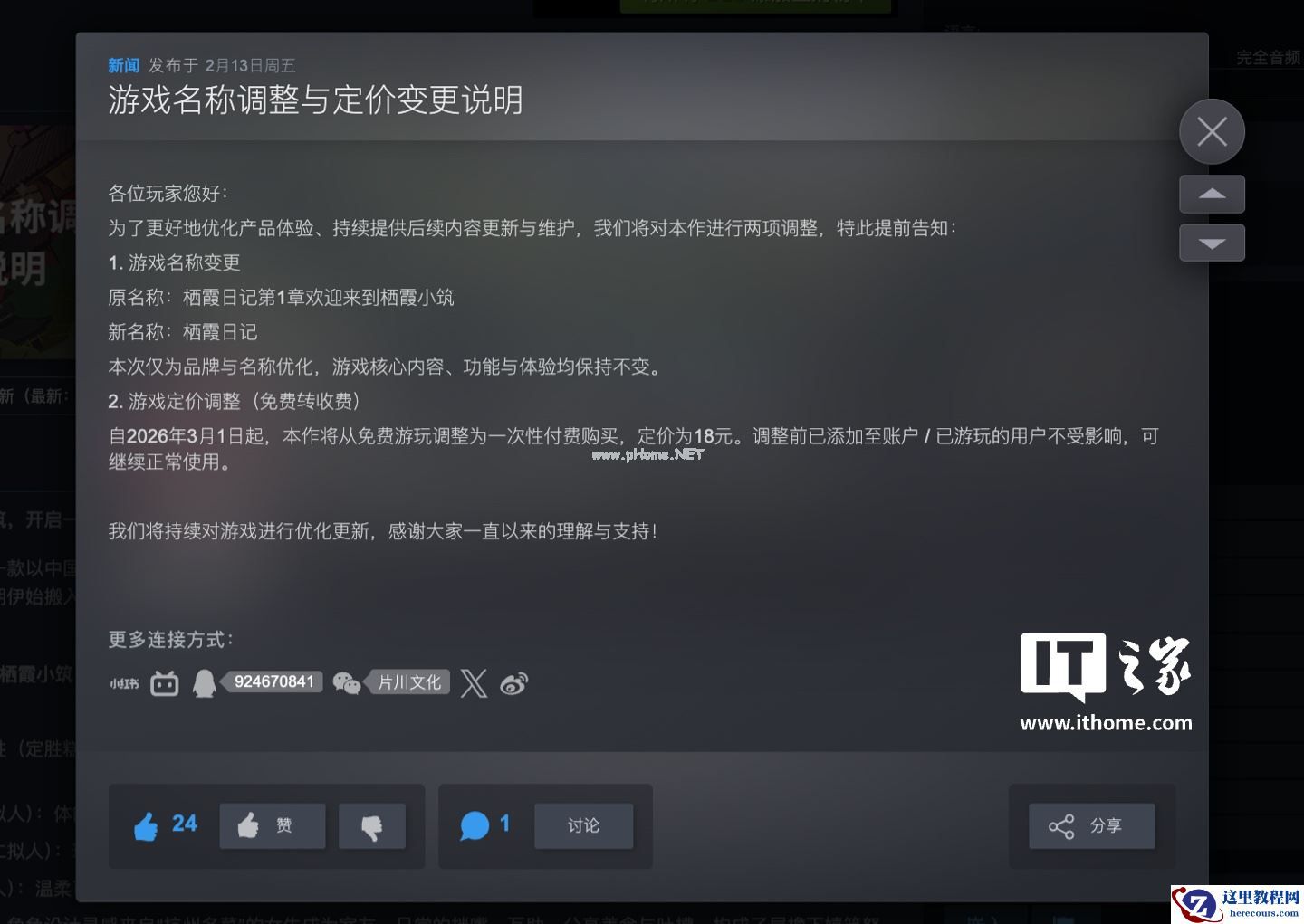 2 月 16 日消息,独立游戏团队片川文化在 Steam 平台免费推出的文字冒险小说《栖霞日记》宣布将于 2026 年 3 月 1 日起改为付费销售。