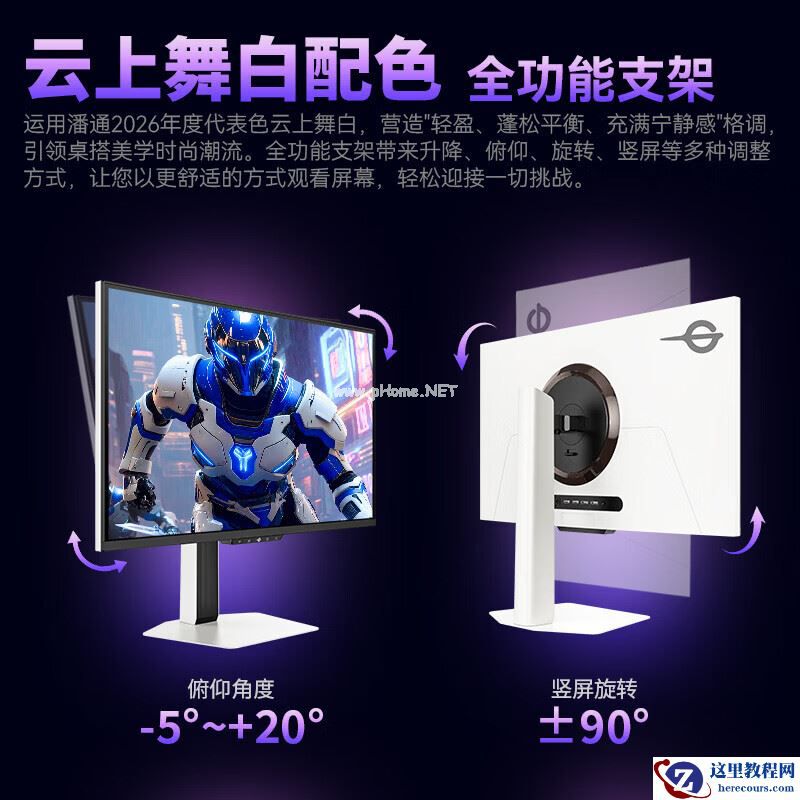 该机支架支持升降 / 倾斜 / 旋转,显示器本体支持 VESA 100x100mm 壁挂,提供了 2 个 HDMI 2.1、2 个 DP 1.4、1 个 3.5mm 音频接口。