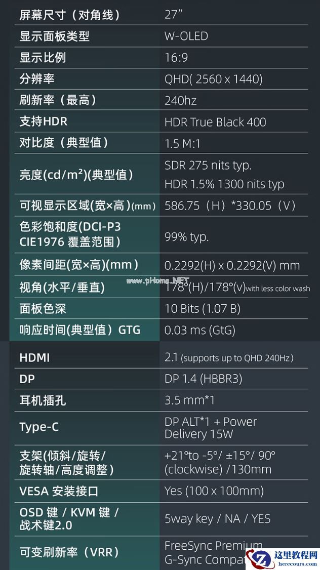这款显示器搭载一块 2560x1440 分辨率 240Hz W-OLED 面板,能够有效减少光线漫射,支持 10-Bit 色深,覆盖 99% DCI-P3 色域,满足游戏之余的观影、修图需求,GTG 响应时间为 0.03ms,让用户在 FPS 游戏中抢占先机,兼容 G-Sync 防撕裂技术。