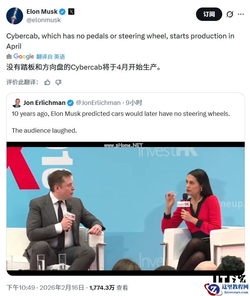1 月 23 日,他宣布“Cybercab 将于 4 月投产”。2 月 16 日他再次重申这一时间,这已是马斯克第三次将这款车的初始生产时间定在 4 月。