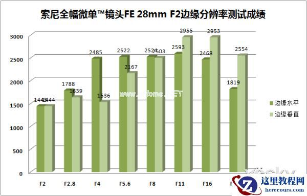 再来看看28mm焦段镜头的边缘测试成绩,在F4到F16这段区间内,水平分辨率都已经超过2400线。从测试成绩上可见,峰值出现在F11上,说明F8为最佳光圈。