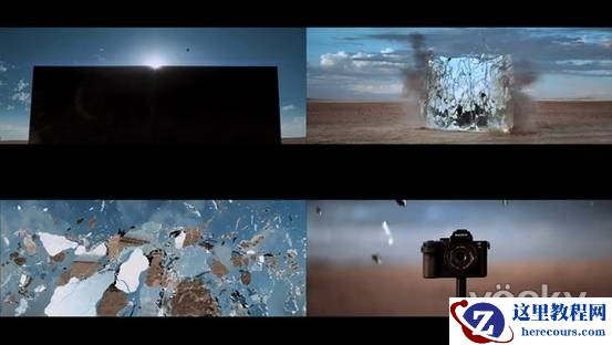 在视频中,一片竖立在戈壁中的方镜带着迫人的气势矗立着,偶尔闪现出一道冷冷的寒光。突然,光洁的镜面自上而下出现了一道蛛网式的裂纹,然后在电光火石间这片仿佛亘古不变的方镜刹那间便分崩离析,碎落一地。大量的慢镜头拍摄充分展现了镜面粉身碎骨的华丽瞬间,这一刻让人感觉时间已经流逝许久但实际一切却是在瞬间发生的。此时,镜头转换:在满地的碎镜片映衬下,一台索尼的微单相机缓缓露出真容。
