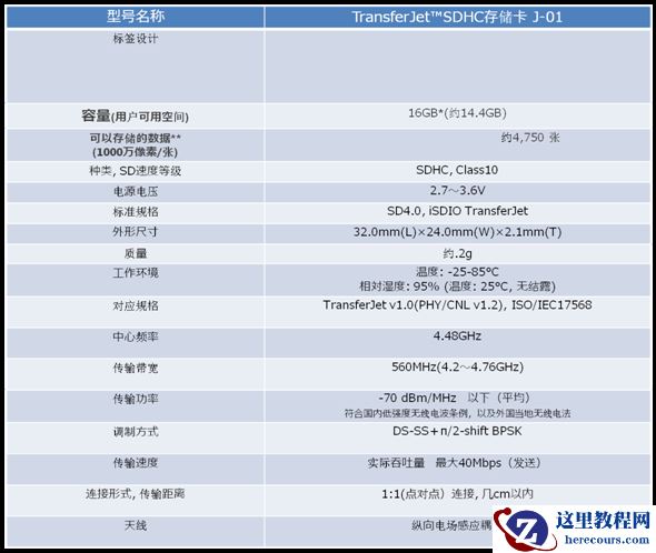 这次新发布的搭载TransferJet™功能SDHC存储卡规格基于SDA规格。在使用过程中设备之间只要相互靠近,无需网络环境就能直接传送照片或者视频。两款设备的最大通信距离约3cm、通信泄露可能性低,安全性高,且可以稳定高速传输。在使用前不需要麻烦的设定,在已有的相机插入本卡,即可使用TransferJet™功能。