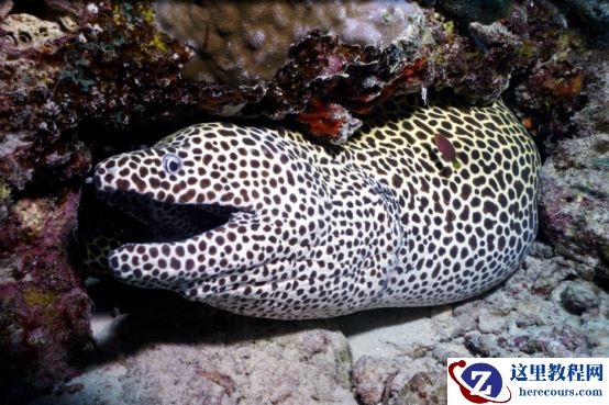 回到前面“单灯”的话题,在此分享一点布光方面的体会:在拍摄一窝鳗鱼(honeycomb moray)的时候,我一开始是中规中矩地将灯放在正面上方的位置,以求打光均匀。但拍出来的效果很平淡,如下图: