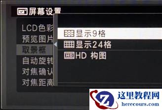 在屏幕设置选项中选择取景框,打开“显示9格”