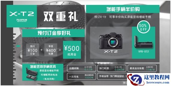 可与此前刚刚发布的旗舰X-T2配合使用,目前X-T2的预售活动正火爆进行中!抢先预订可享受双重优惠购活动(7月21日-9月8日):第一重—预付订金翻倍优惠礼;第二重预订相机可享受半价购买原装竖拍增能手柄。(限量供应,订完为止)!