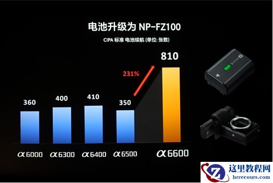作为系列中的新旗舰担当,Alpha 6600不出意外的如前台一样搭载了机身5轴防抖。此外,在续航方面做出了重大提升。电池由原先的NP-FW50升级为了现在全画幅系列的NP-FZ100,电池容量提升近1倍,但从官方提供的续航数据来看,续航较Alpha 6500提升了231%。当然,其中新的处理器必定也功不可没,更高的工艺制程使其拥有更高更迅捷的处理能力的同时却大大降低了功耗。