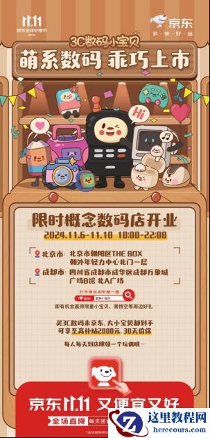 京东的限时概念数码店将于11月6日至11月10日在北京和成都开放,其中北京门店位置在北京市朝阳区THE BOX朝外年轻力中心北门一层,成都门店位置在四川省成都市成华区成都万象城广场B馆北A广场,每日营业时间均为早10点至晚10点