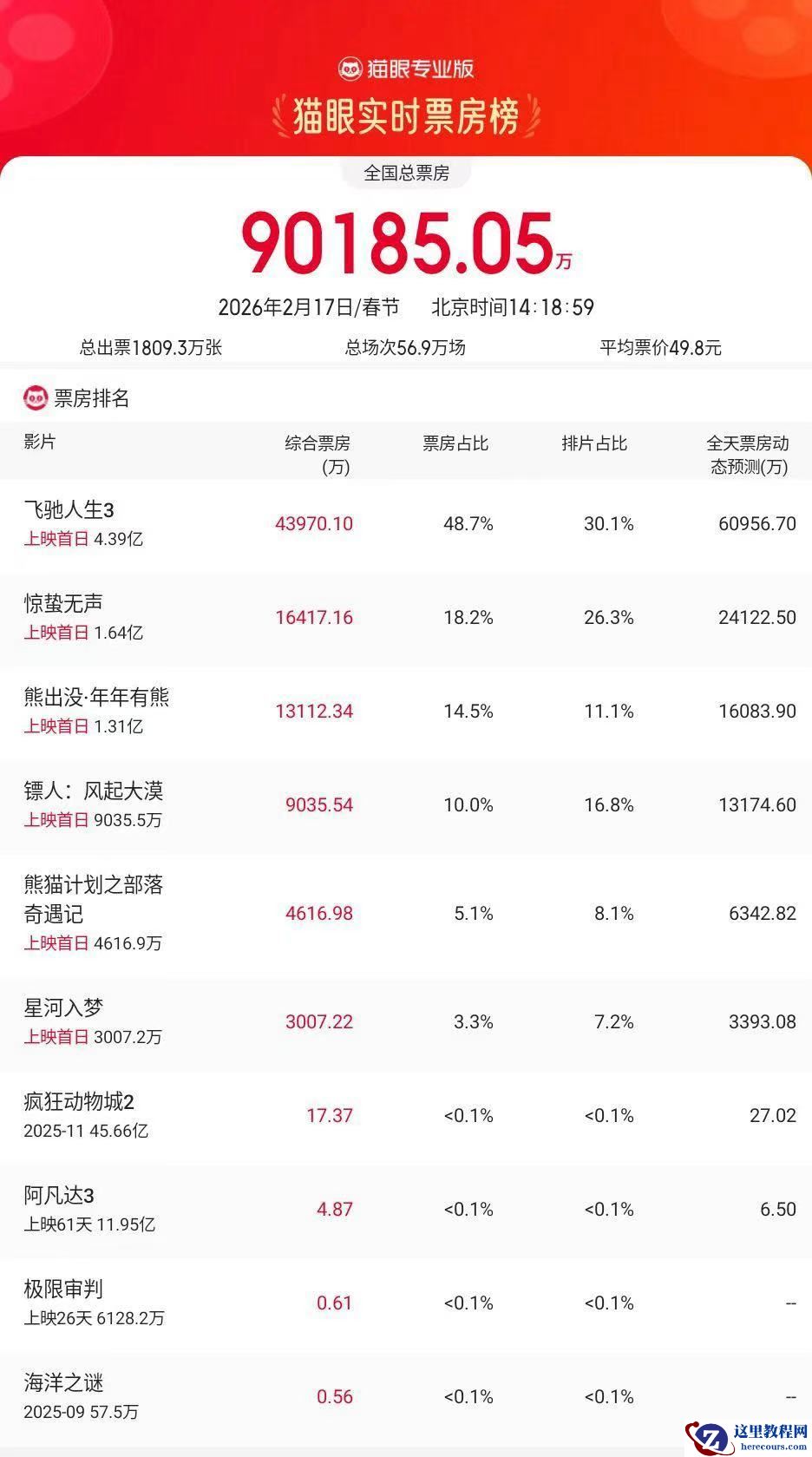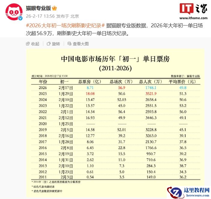 注意到,2026 年大年初一单日场次超 56.9 万,刷新影史大年初一单日场次纪录。