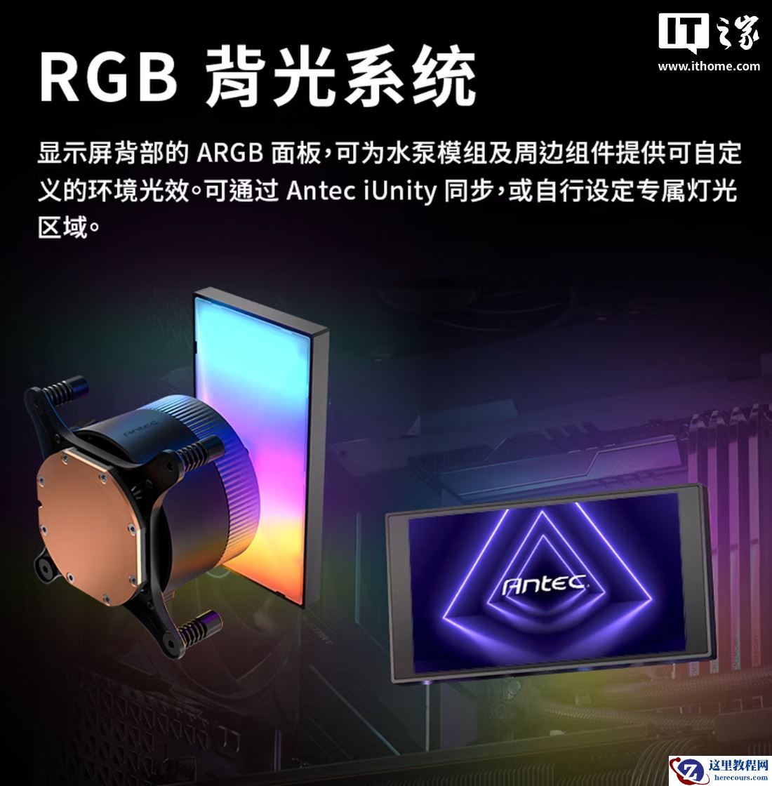 此外,这款散热器内置 ARGB 光效,能够融入极简风 / 高调风装机方案,灯光和 LCD 屏幕支持关闭,满足追求低调人群需求,用户可使用 iUnity 2.0 配套软件调节风扇水泵曲线、自定义 RGB 灯效、更改 LCD 屏幕显示内容等。